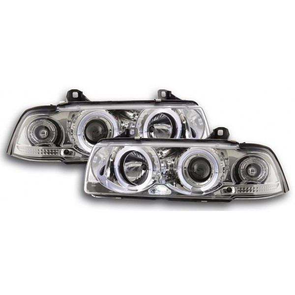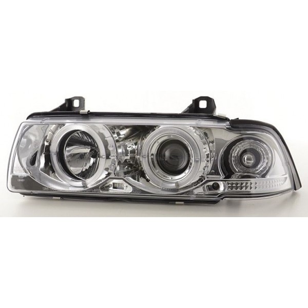 Přední čirá světla BMW E36 Limuzína/Touring (Combi)/Compact 12/1990-08/1999 – el. ovládání(motorky nejsou součástí), dálková světla H1, potkávací světla H1, směrová světla, parkovací světla LED ANGEL EYES kroužky, evropská homologace "E" – vyražena na světlech. Super cena. Uvedená cena je za pár. Jsme přímým dovozcem!!