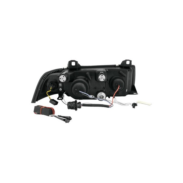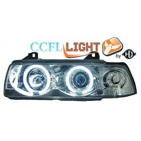 Přední čirá světla BMW E36 Limuzína/Touring (Combi)/Compact 12/1990-08/1999 – el. ovládání(motorky nejsou součástí), dálková světla H1, potkávací světla H1, směrová světla, parkovací světla CCFL ANGEL EYES kroužky, evropská homologace "E" – vyražena na světlech. CCFL (Cold Cathode Fluorescent Light Technologie) = studené katodové fluorescenční světlo. 30x jasnější svítivost než u klasických ANGEL EYES. Super cena. Uvedená cena je za pár.