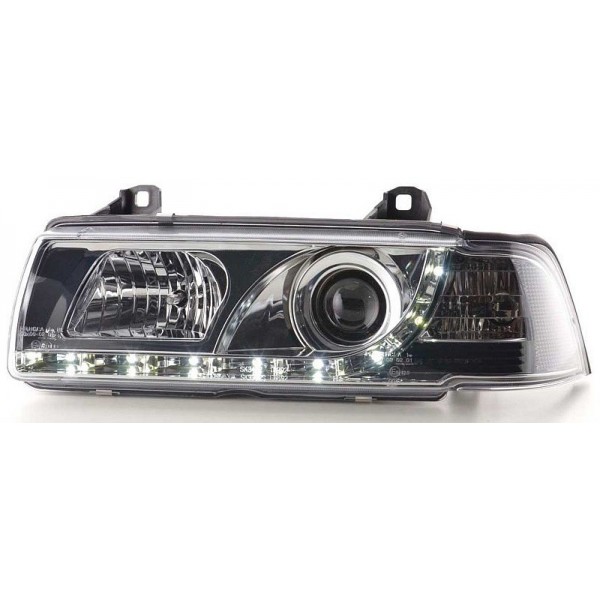 Přední čirá světla BMW E36 Limuzína/Touring (Combi)/Compact 12/1990-08/1999 – el. ovládání(motorky nejsou součástí), dálková světla H1, potkávací světla H1, směrová světla, parkovací světla LED PRUH, evropská homologace "E" – vyražena na světlech. Super cena. Uvedená cena je za pár. Jsme přímým dovozcem!!