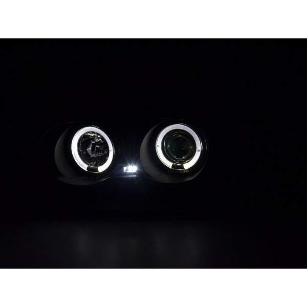 Přední čirá světla BMW 3-řada E46 Limuzína/Touring (Combi) 5/1998-8/2001 - manuální ovládání sklonu, dálková světla H1, potkávací světla H1, směrová světla, parkovací světla LED ANGEL EYES kroužky, evropská homologace "E" – vyražena na světlech. Super cena. Uvedená cena je za pár. Jsme přímým dovozcem!!