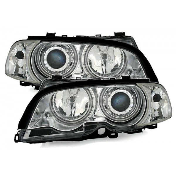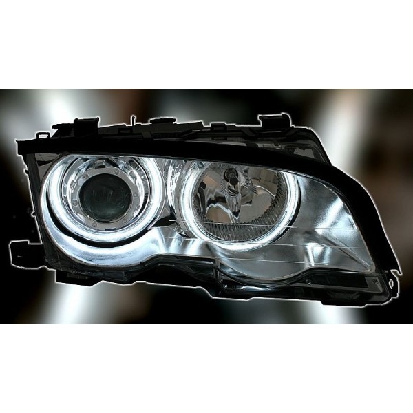 Přední čirá světla BMW 3-řada E46 Coupe/Cabrio 04/1999-08/2001 - el. ovládání(integrované motory), dálková světla H7, potkávací světla H7, směrová světla, parkovací světla CCFL ANGEL EYES kroužky, evropská homologace "E" - vyražena na světlech. CCFL (Cold Cathode Fluorescent Light Technologie) = studené katodové fluorescenční světlo. 30x jasnější svítivost než u klasických Angel Eyes. Super cena. Uvedená cena je za pár. Jsme přímým dovozcem!!