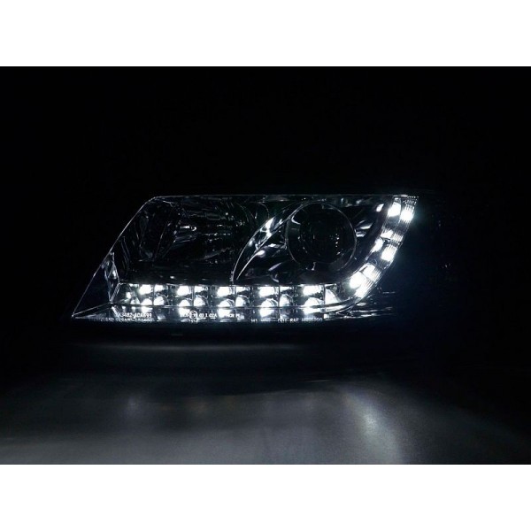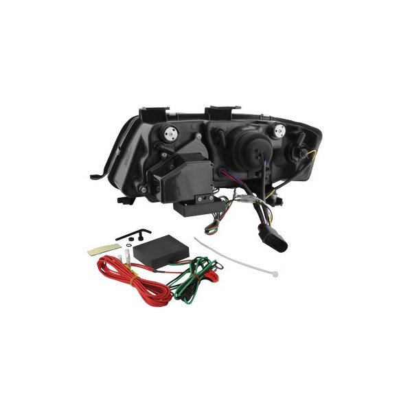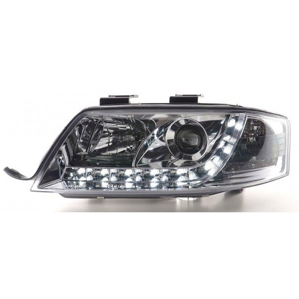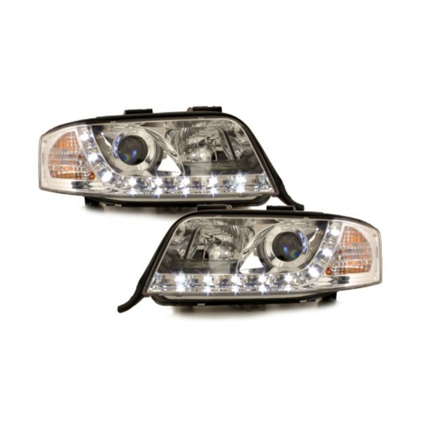 Přední čirá světla Audi A6 C5 4B 6/2001-5/2004 – el. ovládání(dodáváno bez motorků), dálková světla H1, potkávací světla H1, parkovací světla, homologované denní svícení R87 – LED pruh, směrová světla, evropská homologace "E" – vyražena na světlech. Uvedená cena je za pár
