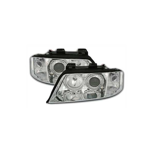 Přední čirá světla Audi A6 C5 4B 6/2001-5/2004 – el. ovládání(dodáváno bez motorků), dálková světla H7, potkávací světla XENON D2S (výbojka není součástí), směrová světla, parkovací světla – ANGEL EYES kroužky, evropská homologace "E" – vyražena na světlech. Super cena. Uvedená cena je za pár.