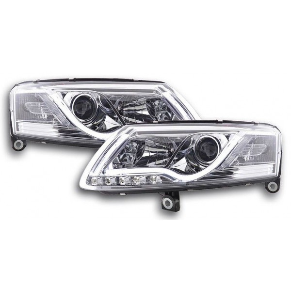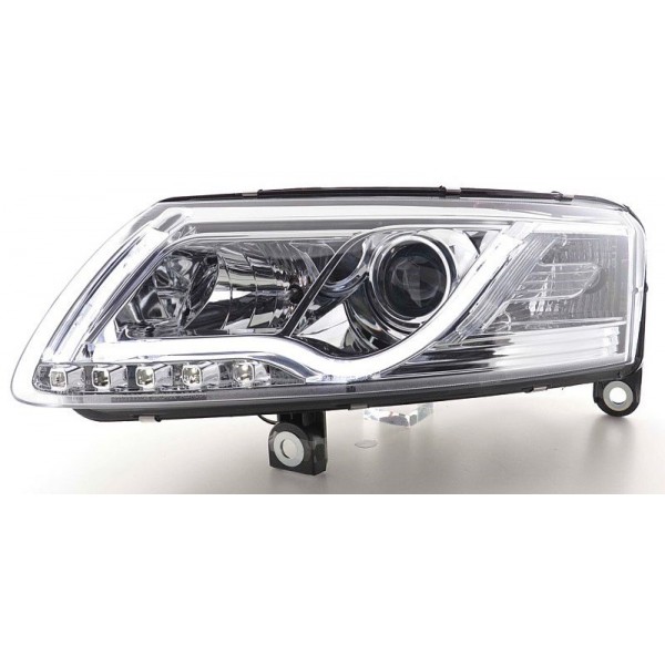 Přední čirá světla Audi A6 C6 4F 4/2004-2008 – el. ovládání(dodáváno bez motorků), dálková světla H1, potkávací světla H1, směrová světla, parkovací světla TUBE LIGHTS pruhy, evropská homologace "E" – vyražena na světlech. Super cena. Uvedená cena je za pár.