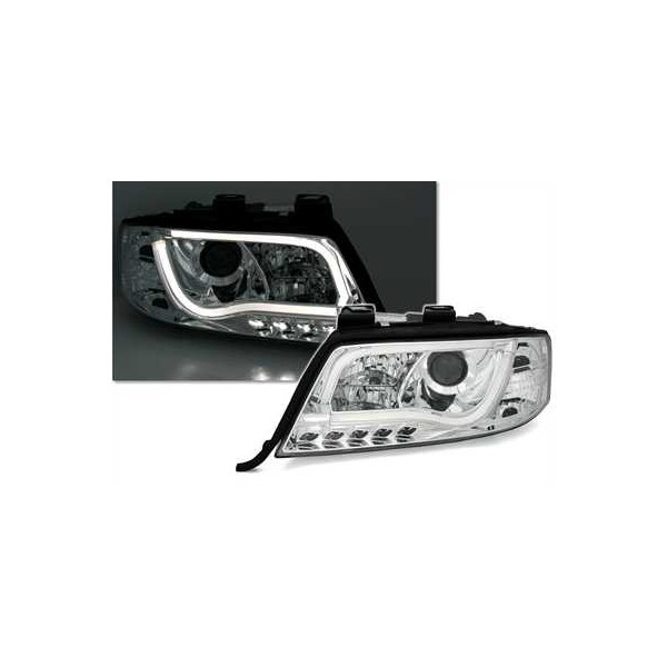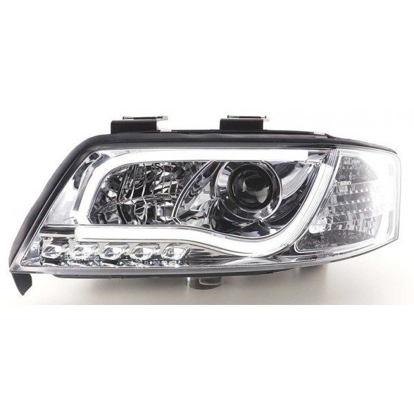 Přední čirá světla Audi A6 C5 4B 6/2001-5/2004 – el. ovládání(dodáváno bez motorků), dálková světla H1, potkávací světla H1, parkovací světla, homologované denní svícení R87 – TUBE LIGHTS pruhy, směrová světla, evropská homologace "E" – vyražena na světlech. Uvedená cena je za pár