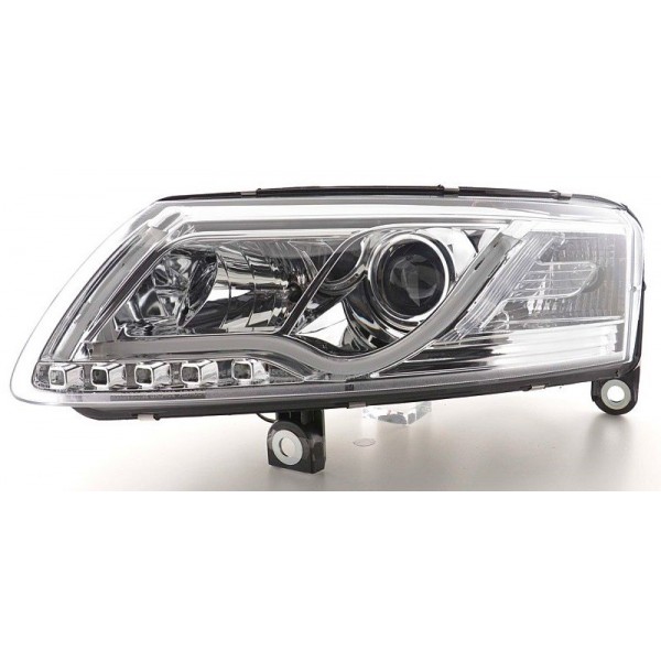Přední čirá světla Audi A6 C6 4F 4/2004-2008 – el. ovládání(dodáváno s motory), dálková světla H1, potkávací světla XENON D2S (výbojka není součástí), homologované denní svícení R87 - TUBE LIGHTS pruhy, směrová světla, evropská homologace "E" – vyražena na světlech. Uvedená cena je za pár.