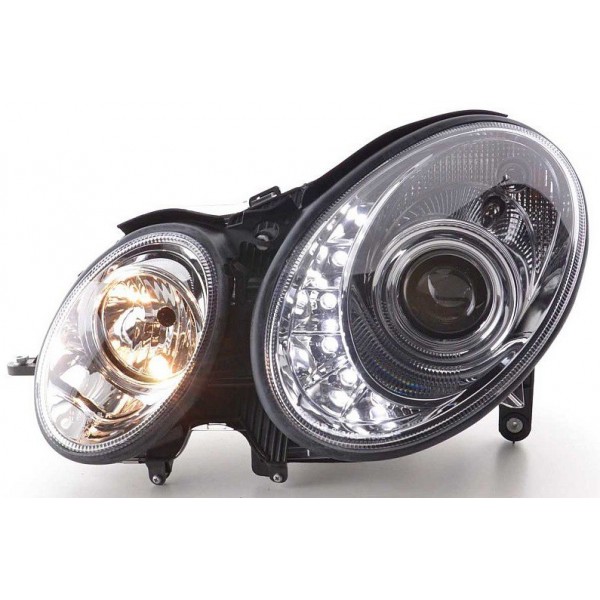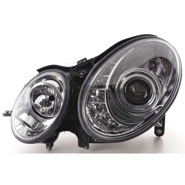 Přední čirá světla Mercedes Benz W211 E-tř. 02-06 s denním svícením – el. ovládání(integrované motory), dálková světla, potkávací světla XENON patice, denní svícení místo parkovacích světel, směrová světla, evropská homologace "E" – vyraženo na světlech. Super cena. Uvedená cena je za pár. Jsme přímým dovozcem!!