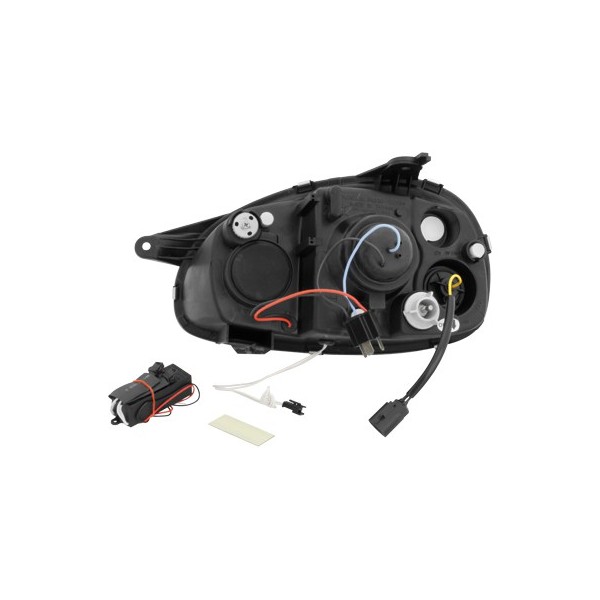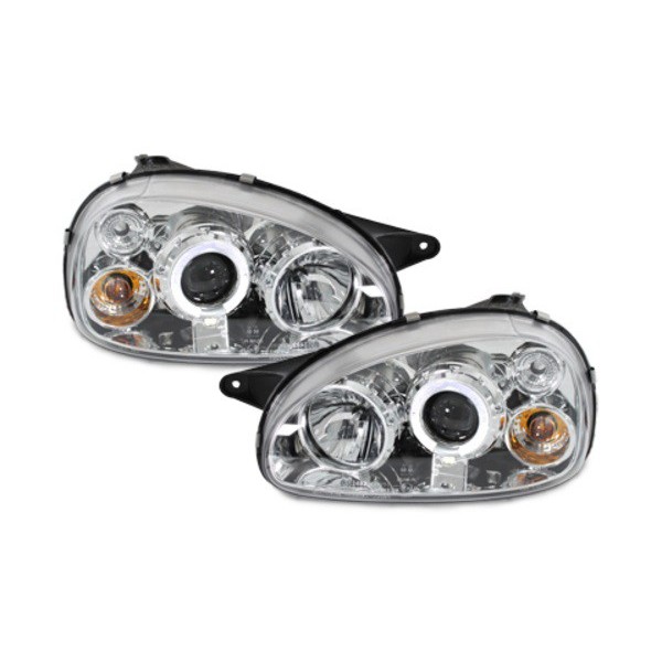 Přední čirá světla Opel Corsa B 3/5dv. 03.93-01 – dálková světla, potkávací světla, směrová světla, CCFL NEON angel eyes, evropská homologace "E". CCFL (Cold Cathode Fluorescent Light Technologie) = studené katodové fluorescenční světlo. 30x jasnější svítivost než u klasických Angel Eyes. Super cena. Uvedená cena je za pár. Jsme přímým dovozcem!!