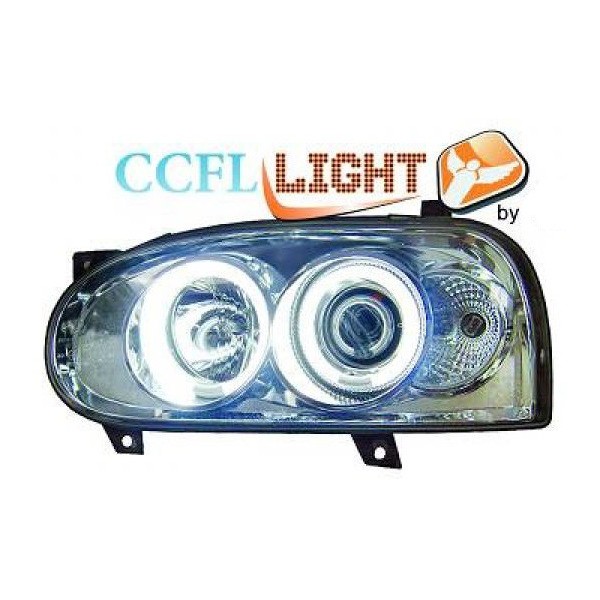 Přední čirá světla VW Golf III 92-98 – el. ovládání, dálková světla, potkávací světla, CCFL NEON angel eyes, evropská homologace "E". CCFL (Cold Cathode Fluorescent Light Technologie) = studené katodové fluorescenční světlo. 30x jasnější svítivost než u klasických Angel Eyes. Super cena. Uvedená cena je za pár. Jsme přímým dovozcem!!