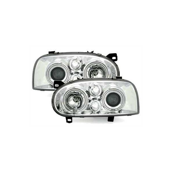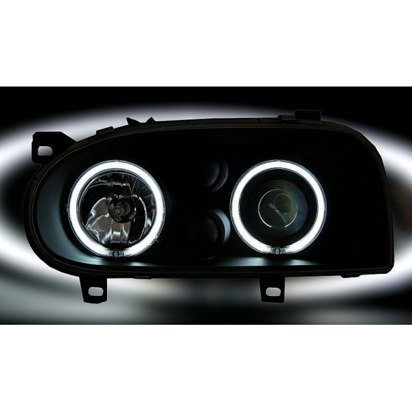 Přední čirá světla VW Golf III 92-98 – el. ovládání, dálková světla, potkávací světla, CCFL NEON angel eyes, evropská homologace "E". CCFL (Cold Cathode Fluorescent Light Technologie) = studené katodové fluorescenční světlo. 30x jasnější svítivost než u klasických Angel Eyes. Super cena. Uvedená cena je za pár. Jsme přímým dovozcem!!