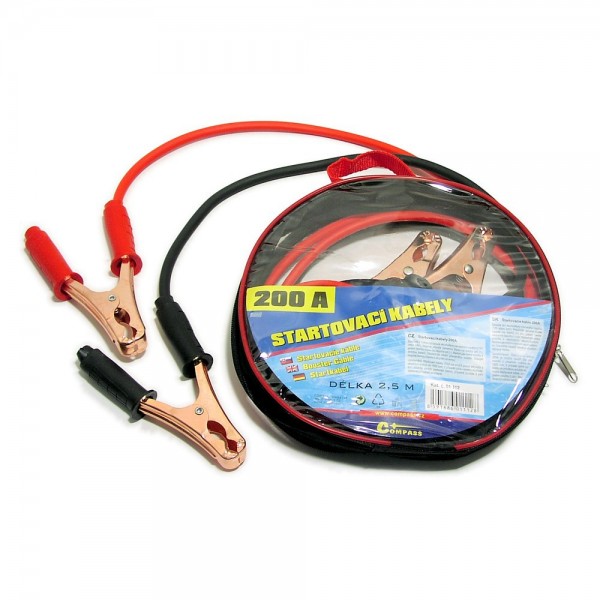 Kabel je vyroben ze 100% mědi. Neobsahuje žádné přísady jiných kovů, které snižují účinnost startovacích kabelů. Barevně označené startovací kabely se svorkami na akumulátor. Max. proud 200 ampér, délka 2,5 metru. Uzavíratelné balení "zipper bag", snadné uložení startovacích kabelů do praktického na zip uzavíratelného obalu.